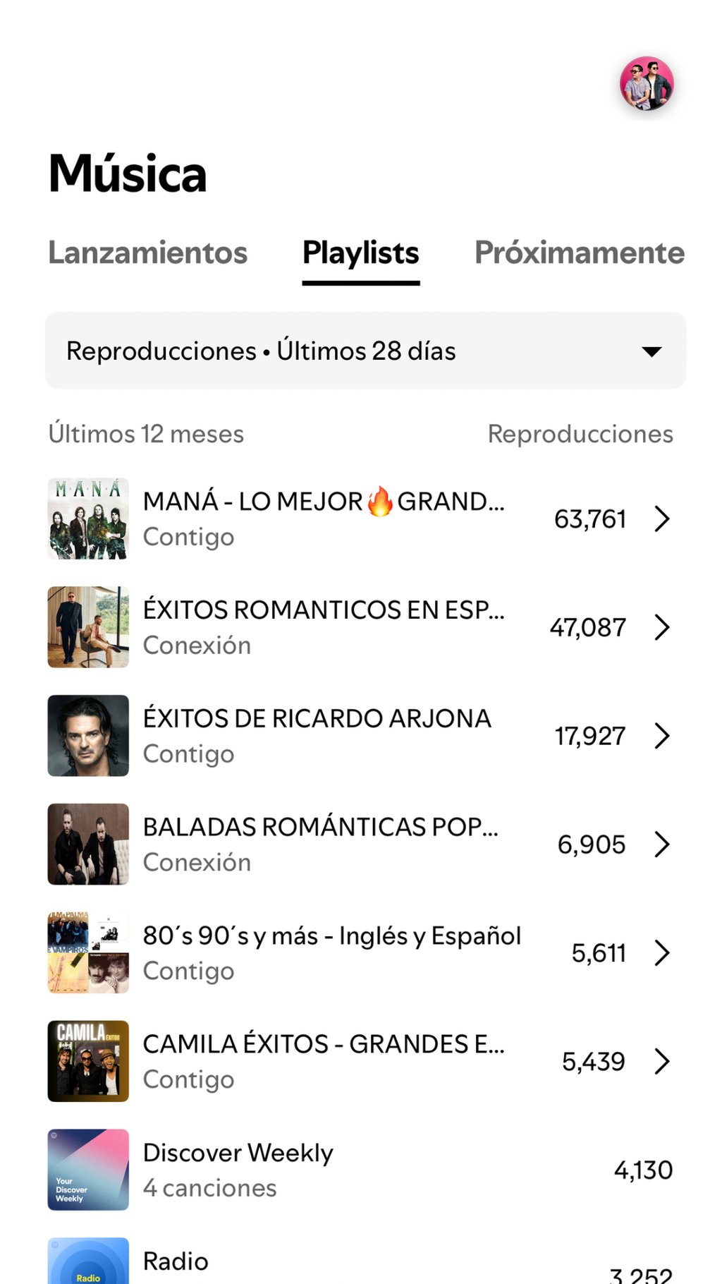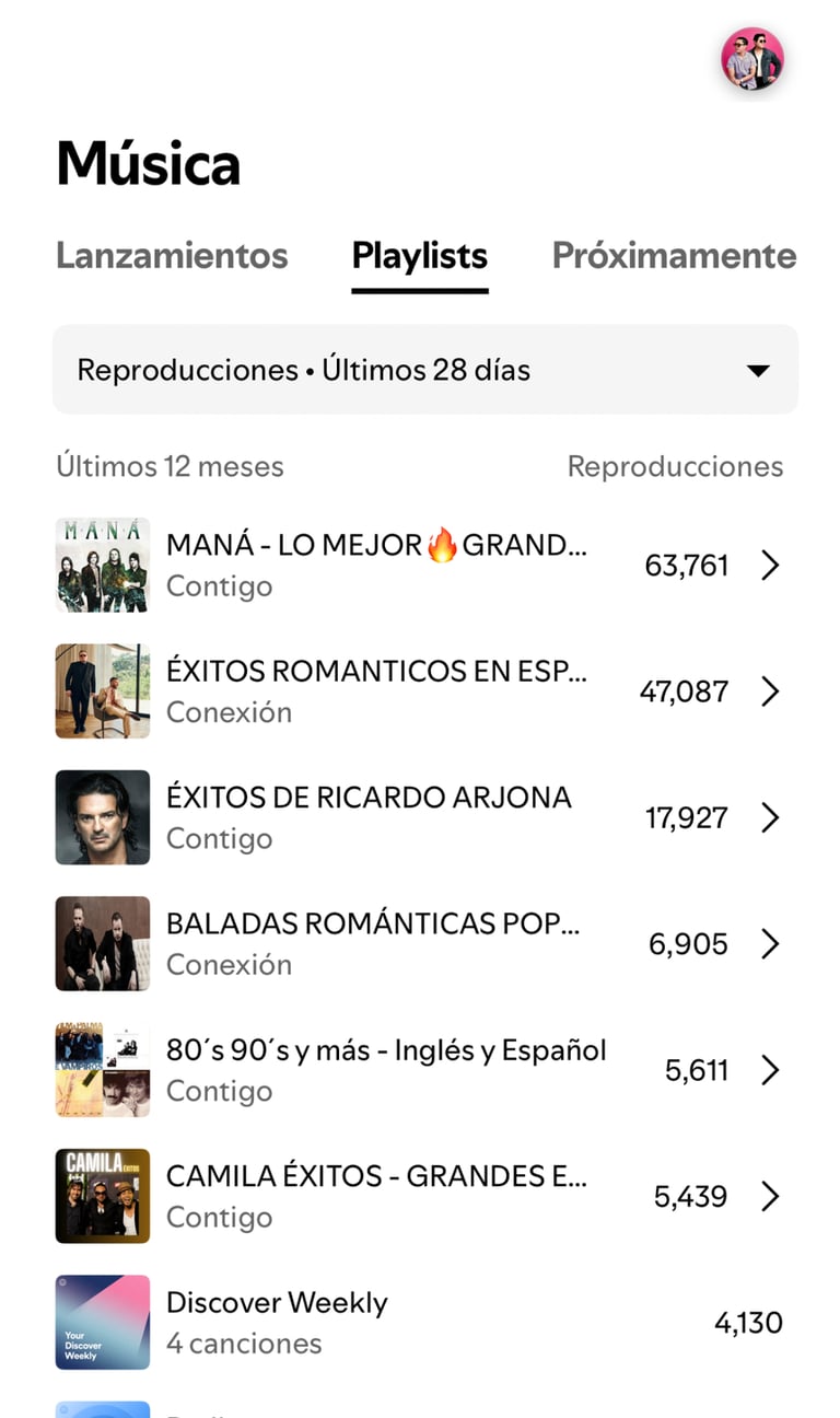 Una vez ingresada tu canción a playlists, nuestro equipo te enviará las playlists donde estara sonando tu canción, y se llevara analisis en tu spotify for artist.